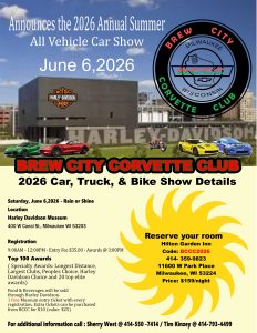 Brew City Corvette Club, Announces the 2026 Annual Summer ALL Vehicle Car Show JUNE 6, 2026. see details below
